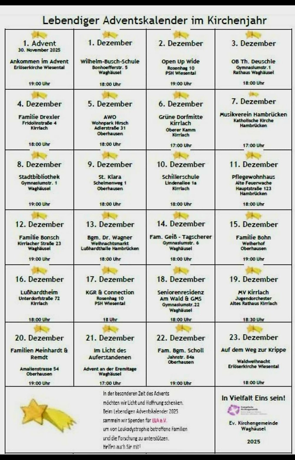 Die Evangelische Kirchengemeinde Waghäusel sammelt in diesem Jahr Spenden für ELA e.V., durch den Lebendigen Adventskalender.