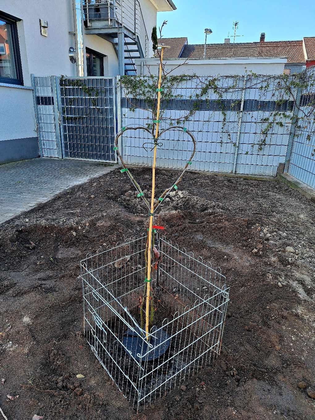 Auf diesem Platz stand jahrelang ein Spielhaus mit Sandkasten, welches in die Jahre gekommen war und zerfallen ist. Nio spielte da oft "Küchenschlacht" und bekochte uns. Nun steht dort ein Familien-Herzbaum, den Nio ausgesucht hat und wir alle zusammen eingepflanzt haben.